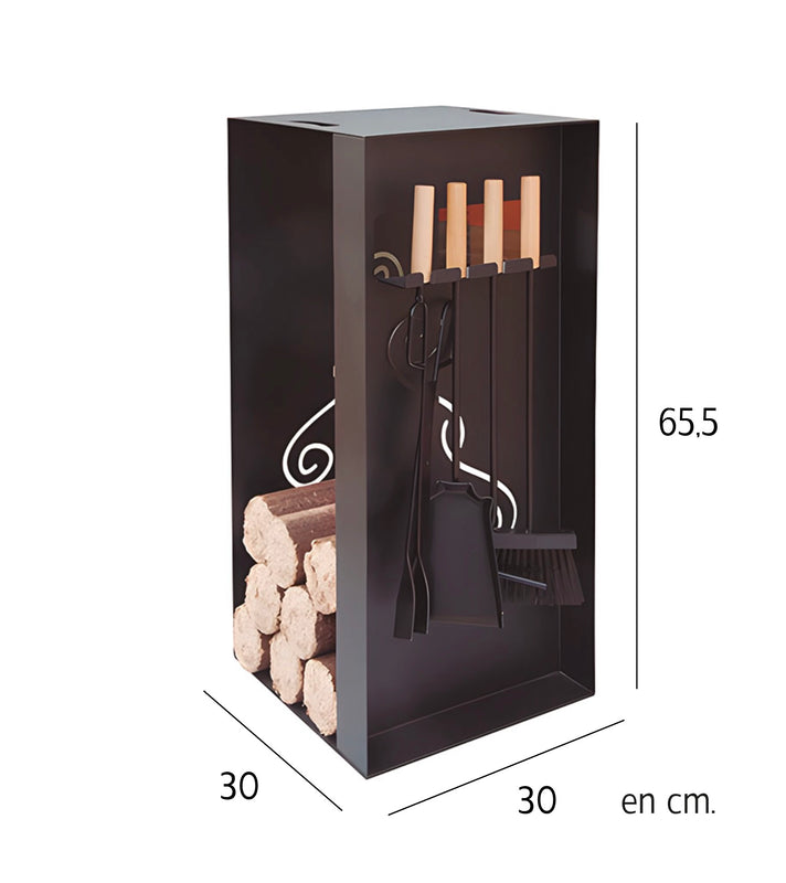 Conjunto diseñado para mantener organizada y accesible la leña, además de facilitar el manejo y mantenimiento del fuego en chimeneas o estufas.
