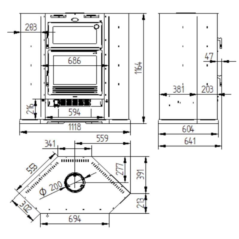 Esta estufa está fabricada con placas de acero de 4mm de grosor, pintadas con esmalte anti calórico en color negro satinado, resistente hasta 800ºC. Su diseño en triangular la hace perfecta para colocar en esquinas y rincones. Consigue la máxima eficiencia energética con su sistema de doble y triple combustión, quemando la madera y los gases que libera. Su cristal vitrocerámico resiste hasta 750ºC y cuenta con sistema de cristal limpio: crea una corriente de aire delante del cristal que ayuda a mantener el cristal libre de hollín durante más tiempo. Puertas y rejilla fabricadas en fundición. Interior de la cámara de combustión revestido en placas de vermiculita, un material ligero y muy resistente al calor que aísla la pared trasera del calor de la leña. Horno con base de ladrillo refractario y paredes de acero inoxidable, con termómetro de vaina en la puerta para conocer la temperatura del interior. Incluye bandeja y parrilla de acero inoxidable de 50x35cm para el horno. Además, incluye una parrilla de asados inox de 31x30cm para colocar en la cámara de combustión. Salida de humos superior de 200mm.