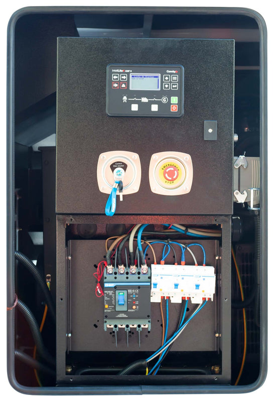 Generador eléctrico trifásico diésel insonorizado de gran potencia para uso industrial. Con la potencia máxima de 66 kVA capacidad de suministrar corriente eléctrica de forma continua. Generador 1500 rpm trifásico insonorizado DG66KSE Botones de parada de emergencia (uno fuera del grupo y otro en el panel de control). Arranque manual...