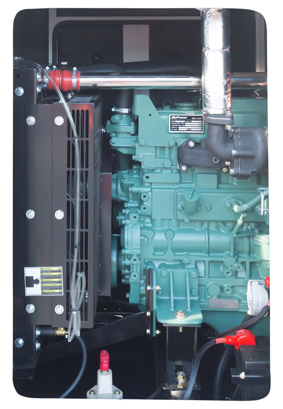 Generador eléctrico trifásico diésel insonorizado de gran potencia para uso industrial. Con la potencia máxima de 66 kVA capacidad de suministrar corriente eléctrica de forma continua.