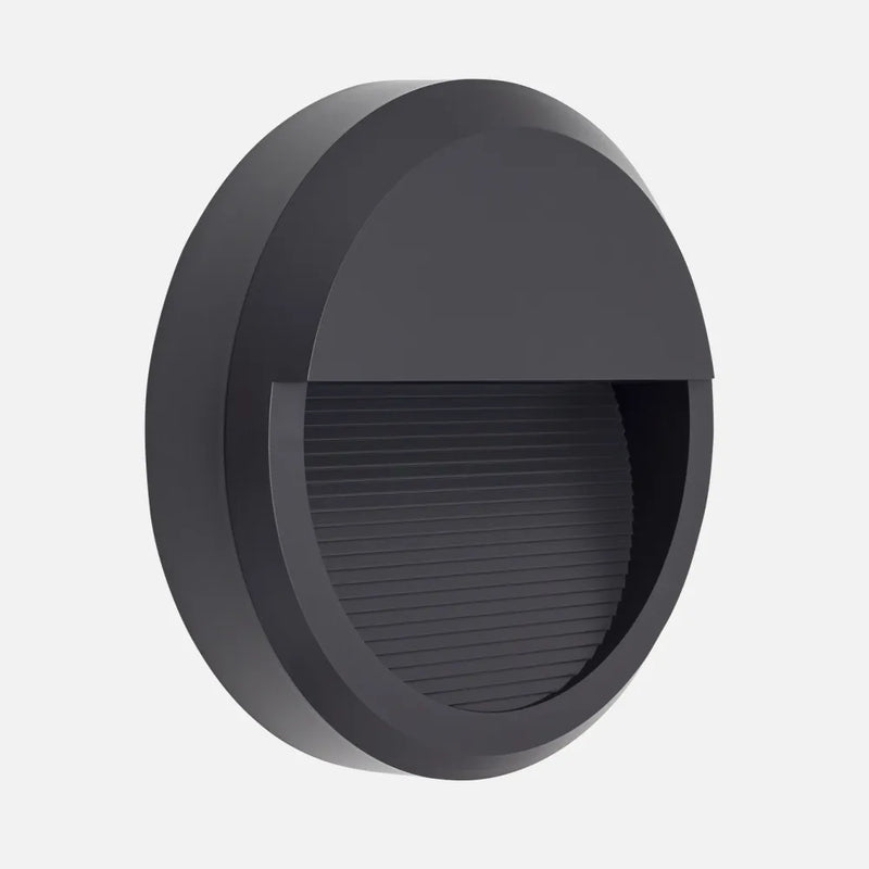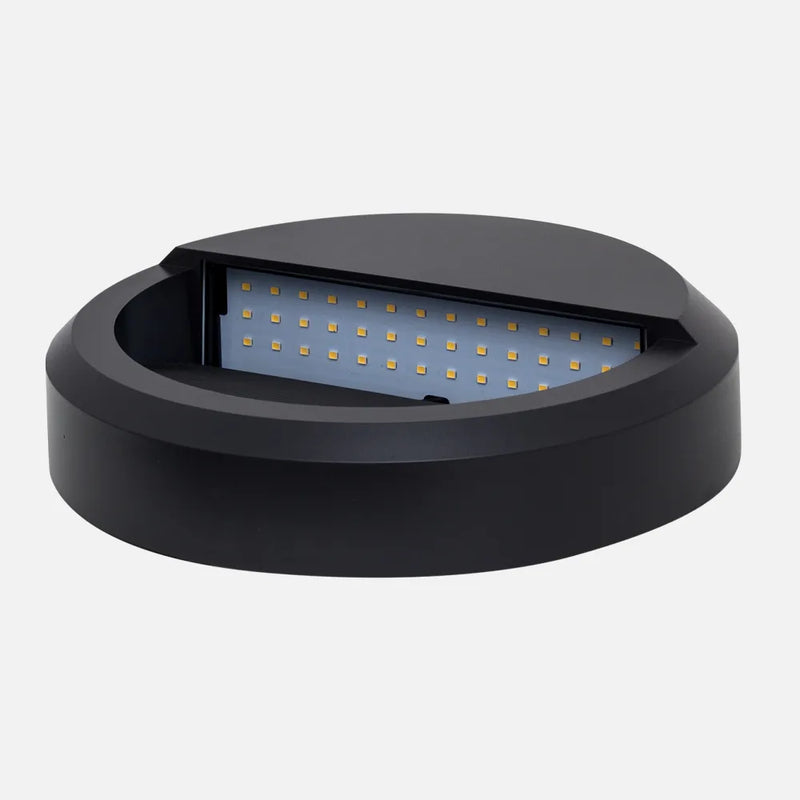 Realizado en metal de color gris oscuro con un índice de protección IP65, De formato circular posee un led integrado de 8 W de potencia, 500 lúmenes y 4000ºk de color de luz blanco natural. La proyección de la luz es directa siendo ideal para crear un punto de luz señalizador. Sus dimensiones son 23x23x5,5 cm.