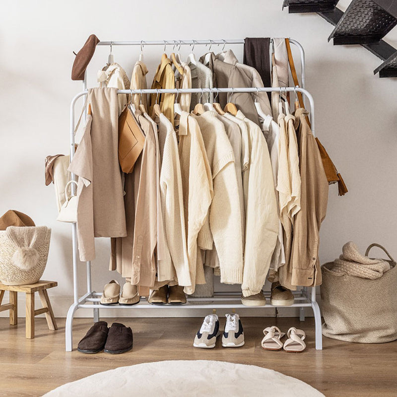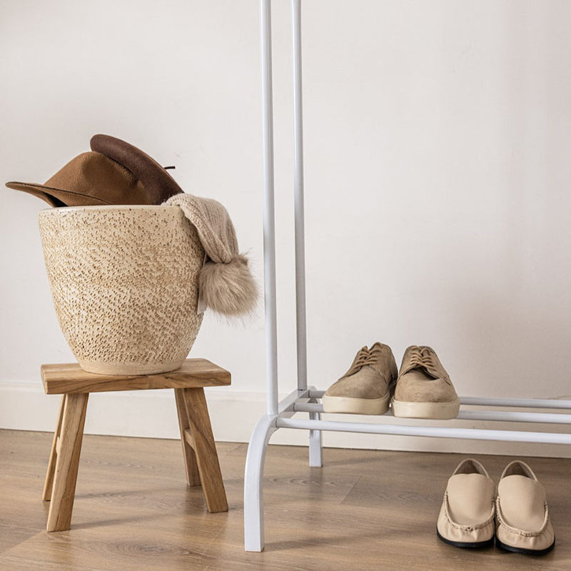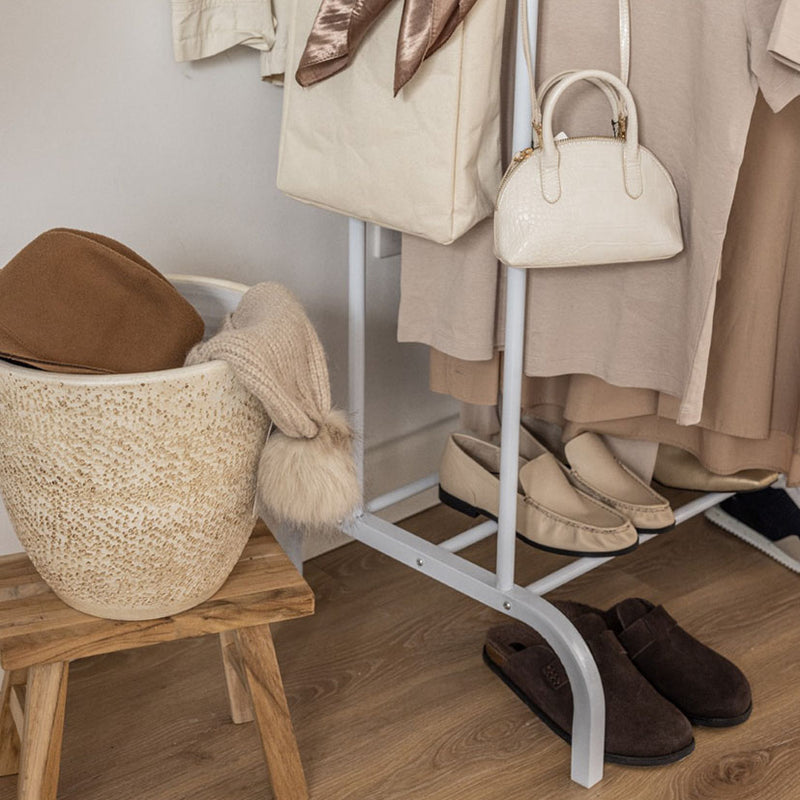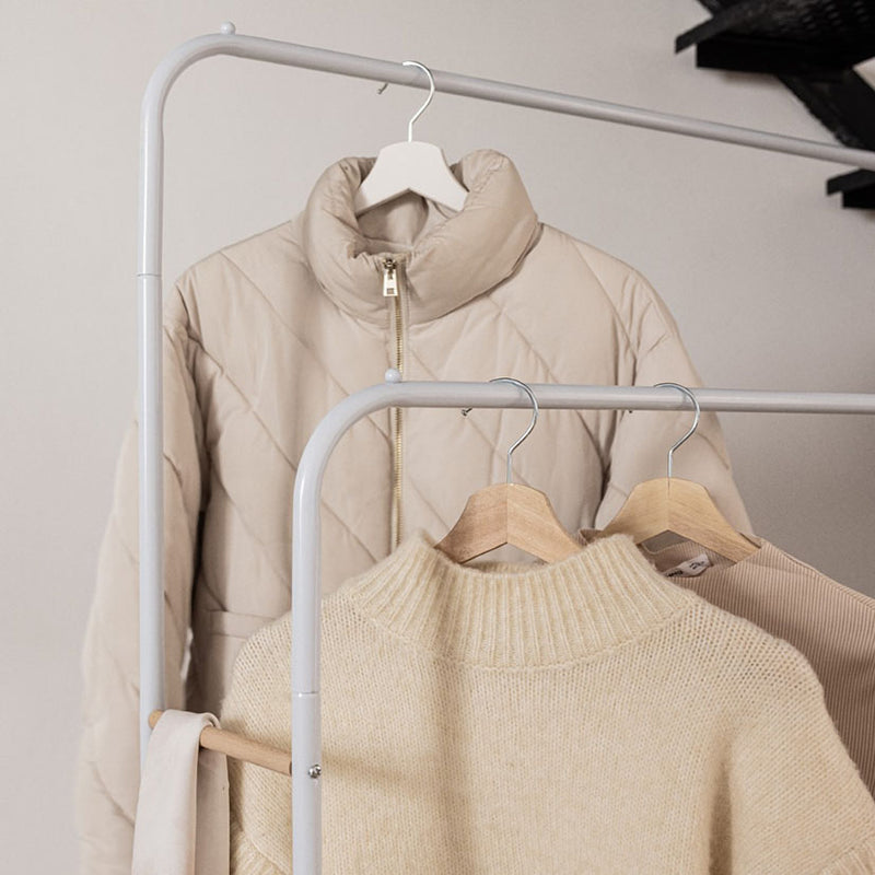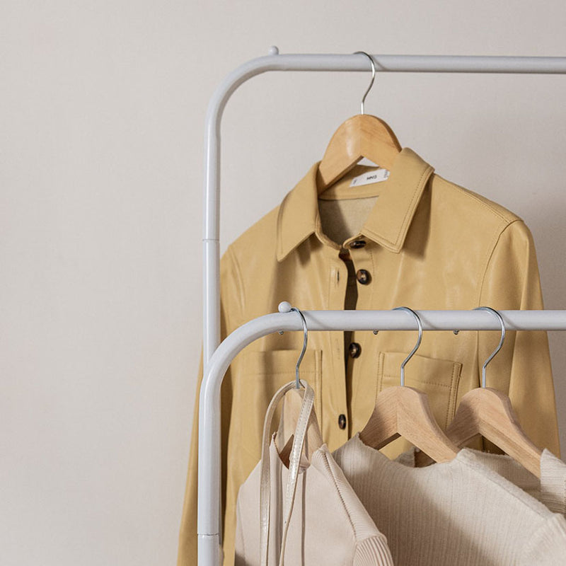Práctico perchero ideal para espacios pequeños o para trasladarlo fácilmente de una habitación a otra.