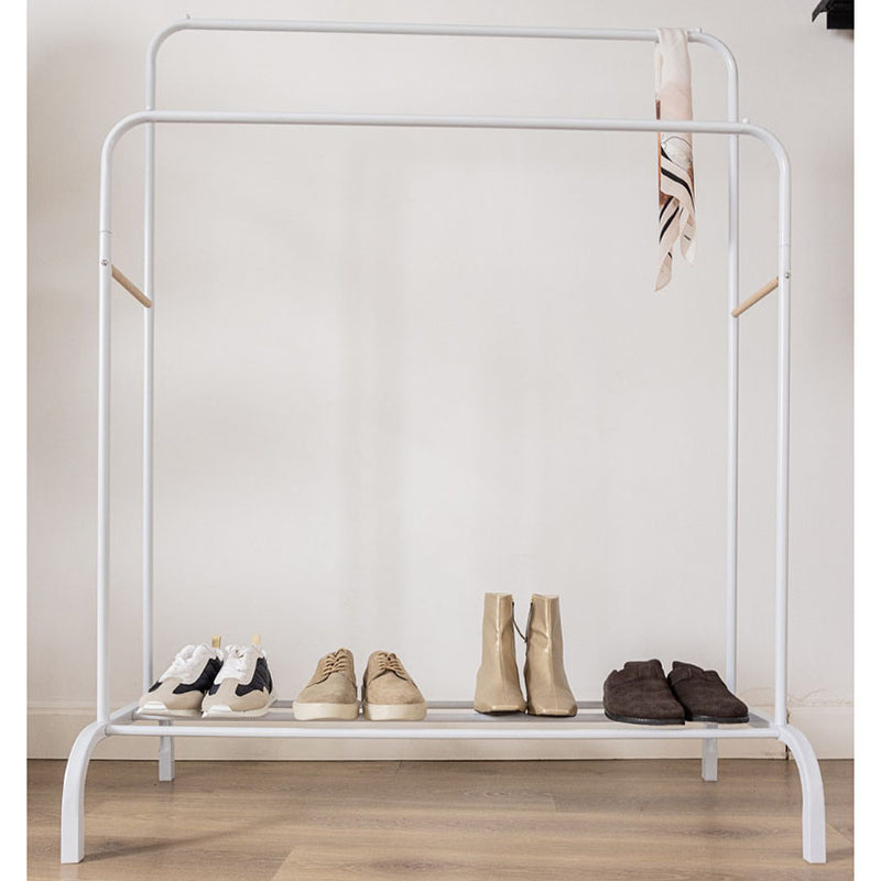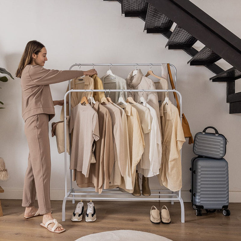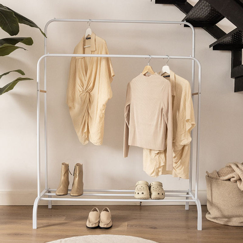Este perchero multiusos es metálico y en color blanco y tiene 2 alturas para colocar la ropa: 131 y 101 cm. Dispone de 2 barras metálicas en 2 niveles con una capacidad de tendido en el nivel 1 de 92,5 cm y en el nivel 2 de 98,5 cm. Además, en el parte inferior del perchero tiene un estante para que puedas colocar zapatos con una capacidad de 109,5 cm. Lo puedes utilizar tanto como perchero o como tendedero para secar ropa en interiores. Soporta una carga de hasta 30 kg. Tiene un fácil montaje y gracias a su diseño compacto y portátil, es perfecto para cualquier espacio del hogar. Las dimensiones totales de este perchero son de 115x50xh.150 cm.