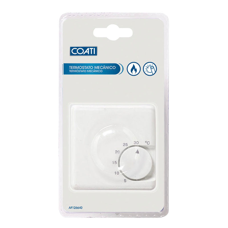 El termostato COATI tiene un fácil manejo y el rango de temperatura que incorpora va de 5ºC a 30ºC. Se selecciona a través de un dial manualmente. Trabaja a 250V y su conexión es mediante 2 hilos. Tiene 3 años de garantía. Tiene unas dimensiones de 7x2,7xh,7 cm.