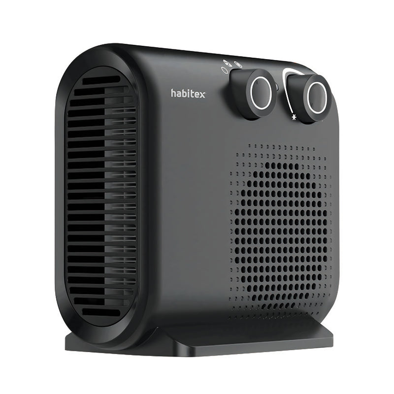 Termo ventilador HABITEX HQ-702 de 2000 W con tres funciones: ventilación, calefacción a potencia mínima y calefacción a máxima potencia. Incorpora termostato regulable y sistema de protección contra sobrecalentamiento. Su diseño permite colocarlo en posición vertical u horizontal para mayor comodidad de uso. Ideal para calentar estancias pequeñas de forma rápida y eficiente.