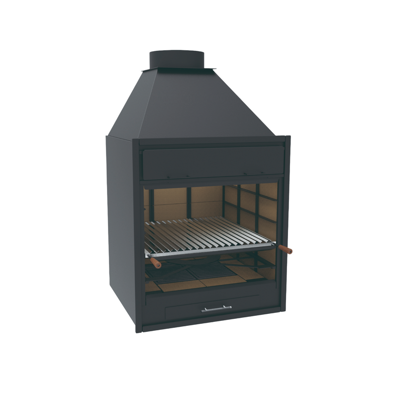 Fabricada en acero al carbono de 4mm de espesor pintada con esmalte anti calórico negra epoxi (No antioxidante) que resiste hasta 800 ºC. Base de barbacoa revestida de ladrillo refractario. Incluye cajón cenicero extraíble, campana y salida de humos, parrilla argentina inoxidable con recogegrasas regulable a 4 alturas: 665 x 665 mm, parrilla de fundición, soporte paellera, regulable a 4 alturas (Capacidad máxima paellera Ø 65 cm) . Salida de humos superior macho: Ø 300 mm. Peso: 150kg.