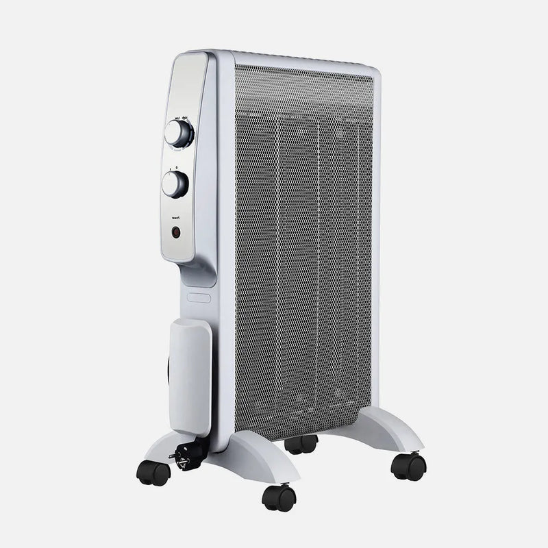 Realizado en metal, policarbonato y mica. Equipado con 1500 vatios de potencia repartidos en sus 3 elementos calefactores de mica, y con dos niveles a elegir, 1000w y 1500w, que permiten calentar rápidamente y eficazmente con bajo consumo cualquier estancia, emitiendo calor por ambas caras, de manera segura y silenciosa. Viene con control de Termostato Ajustable, sistema de protección sobrecalentamiento, Antivuelco y luz indicadora de encendido. Se presenta con un diseño elegante y fácil de transportar gracias a su tamaño y a las ruedas que contiene, y posee un útil recoge cable en su estructura para una mayor seguridad. Tiene unas dimensiones de 61,5x47x26,5 centímetros. Disponible en color BLANCO/PLATA y NEGRO ORO.