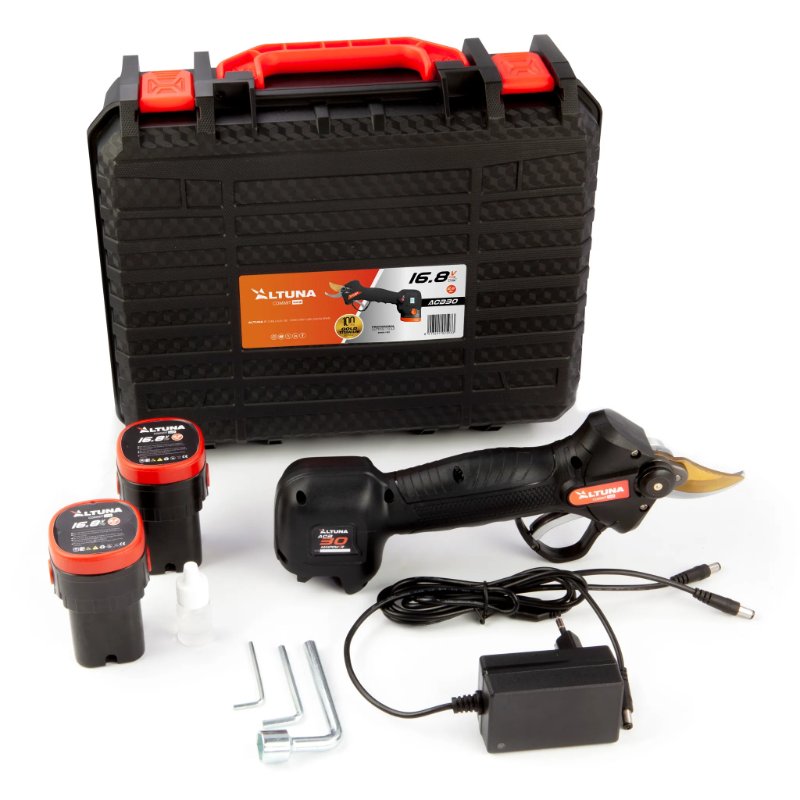 Esta tijera es parte de la gama Altuna Commit+, una serie de productos de poda diseñados en base a la experiencia de los profesionales del sector. Están diseñadas para cumplir las expectativas de los usuarios más exigentes. Esta tijera tiene corte de doble apertura, puede cortar ramas de hasta 19mm o 30mm. Además, la cuchilla es de corte progresivo, podrás controlar el corte con el gatillo. Incluye una pantalla LCD retroiluminada desde la que ver información como el nivel de batería. Cuenta con dos baterías intercambiables que le dan hasta 8 horas de autonomía en conjunto. Es muy ligera, sólo 895 gramos con la batería puesta. Está presentada en un maletín de transporte fabricado en plástico, dentro del cual se encuentra la tijera. sus dos baterías, un cargador con doble toma y un kit de herramientas para el mantenimiento.