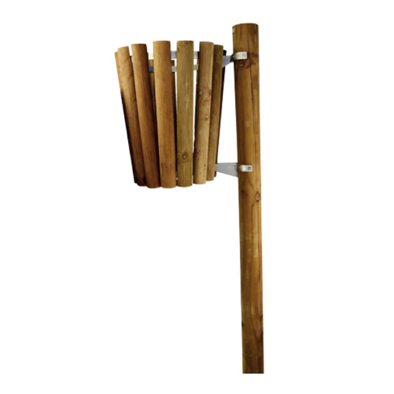 Fabricada con madera de alta calidad, tratada en autoclave, es muy resistente a la intemperie. Al estar fabricada en materiales naturales, pasará desapercibido en parques, jardines y zonas con vegetación. El poste de fijación tiene un altura de 1.5 metros y 15cm de diámetro. La papelea tiene una base de 40cm de diámetro y altura de 47,5cm. Está fijada al poste con herrajes metálicos.