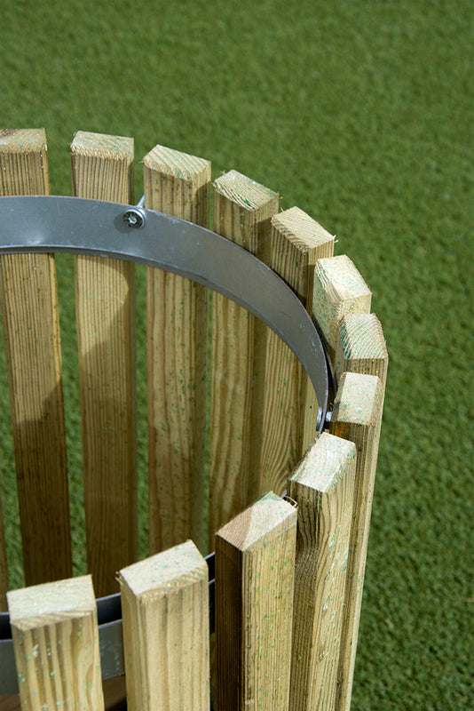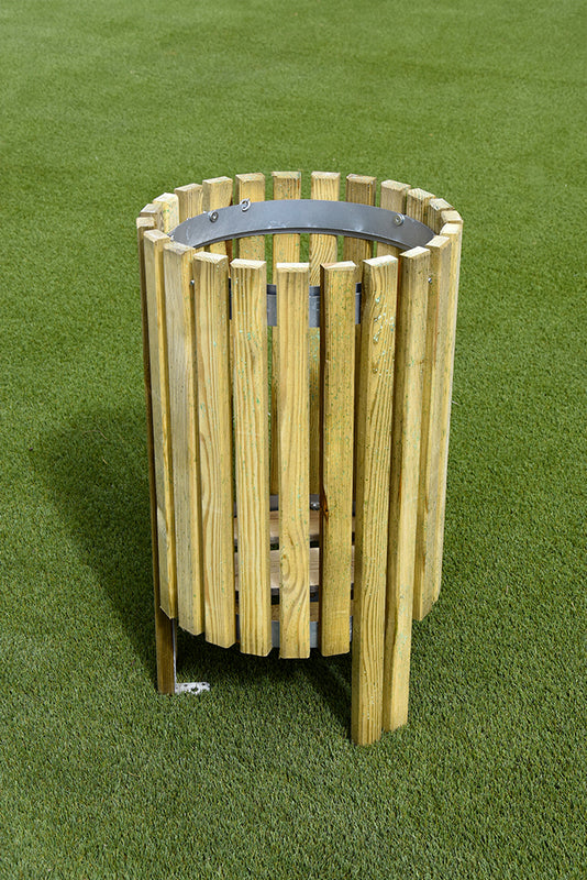 La papelera Iberia es una elegante y funcional solución para cualquier espacio, fabricada en termomadera con protección autoclave nivel 3. Con unas dimensiones de 71,5cm de alto y 42cm de diámetro. Esta papelera es duradera y resistente a las inclemencias del tiempo. Su diseño 100% natural la convierte en la opción ideal para quienes buscan combinar funcionalidad y respeto por el medio ambiente. Además, no destacará en el paisaje gracias a sus materiales. Tiene escuadras metálicas en las patas para fijarla al suelo.