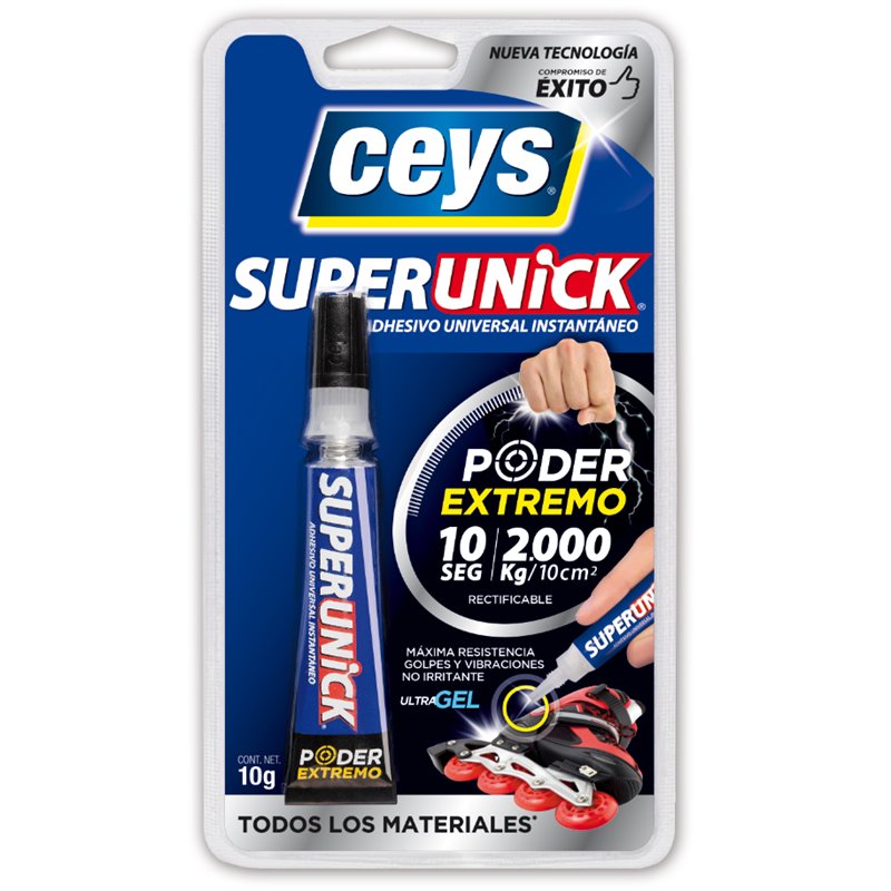 Adhesivo instantáneo poder extremo. Es un adhesivo universal instantáneo de máximas prestaciones y acabados perfectos en 10 segundos. Fuerte, rápido y seguro. Pega todos los materiales salvo no recomendamos que se utilice contra el polietileno, polipropileno. Es resistente a golpes y vibraciones, rectificable y no pega los dedos.
