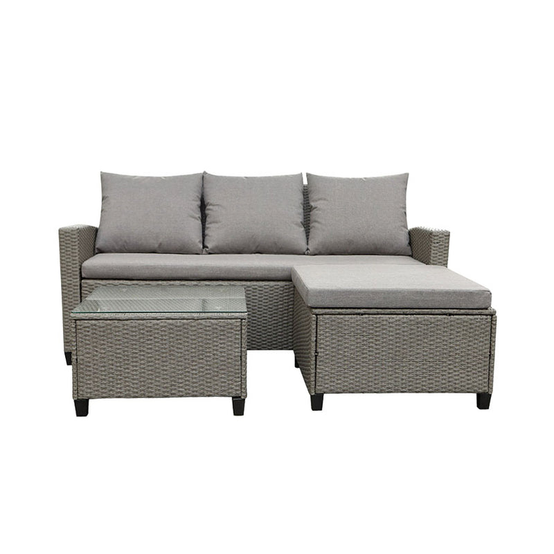 Este conjunto es perfecto para compartir momentos especiales con familia y amigos. Está fabricado por una estructura metálica cubierta de ratán sintético plano en color gris, un material de gran resistencia a la intemperie, con protección UV. Está compuesto por 1 sofá triple de dimensiones 177x76 cm y 82cm de altura, 1 reposapiés de 70x70 cm y 39 cm de altura y una mesa con superficie de vidrio transparente de 63x63cm y 39 cm de altura. Los cojines son desenfundables están fabricados en 100% poliéster y espuma 100% poliuretano, materiales idóneos para exteriores. El reposapiés puede unirse al sofá para crear un chaise longue. Viene presentado en caja, requiere montaje.