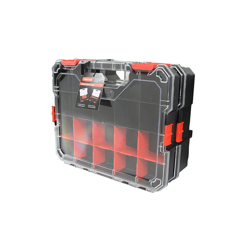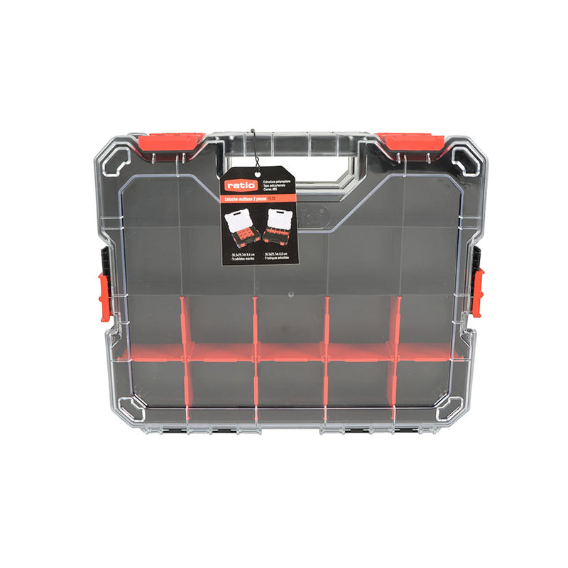 El estuche multiuso 2 piezas RATIO 7620 es un conjunto de organizadores apilables diseñado para almacenar y organizar herramientas y piezas pequeñas de manera eficiente. Fabricado con materiales resistentes, ofrece flexibilidad y personalización en su uso.