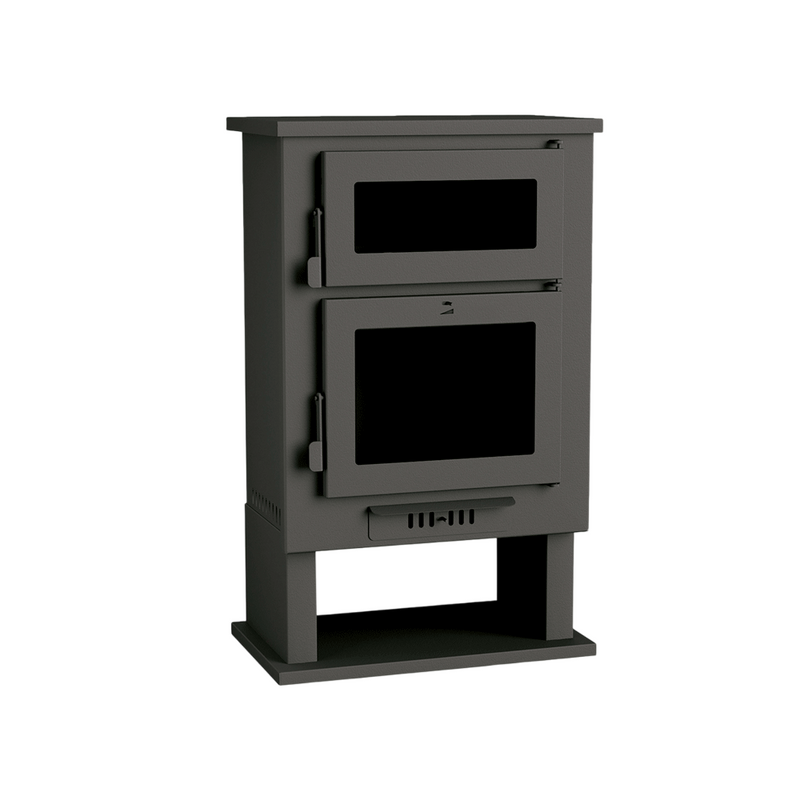 Fabricada con láminas de acero de hasta 4mm de espesor. Pintada con esmalte anti calórico color negro mate, resistente a temperaturas de hasta 800ºC. Potencia nominal de 11.2 Kw. Puertas fabricadas en fundición, con cristal vitrocerámico y cordón de fibra de vidrio. La cámara de combustión cuenta con sistema de cristal limpio, el fujo de aire dentro de la estufa está dirigido para que los residuos de la combustión no se queden pegados en el cristal con facilidad. Incluye parrilla de fundición y cajón cenicero extraíble. Sistema de doble combustión. Salida de humos macho con 150mm de diámetro en la parte trasera de la estufa.