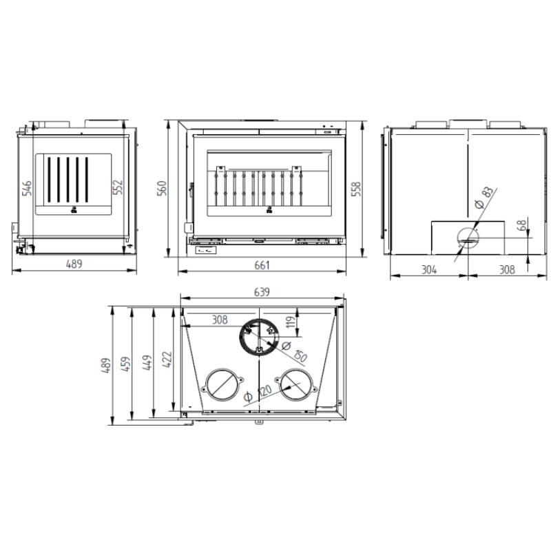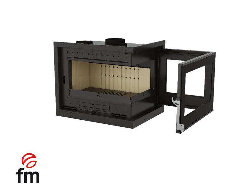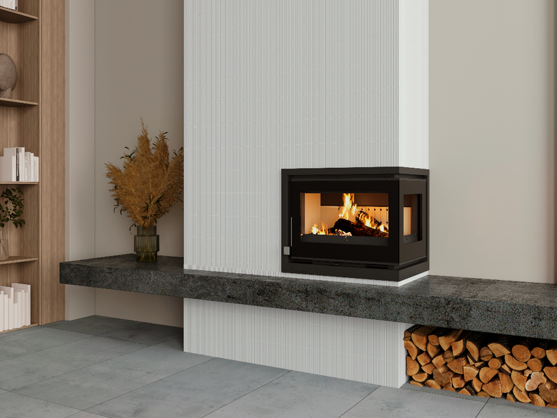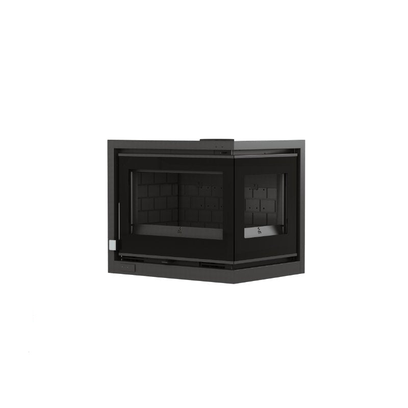 Ideal para calentar su hogar. Presenta un diseño elegante, que se adapta a cualquier espacio. Está pensada para encastrar en esquinas, tiene un cristal en su lateral derecho. Alta eficiencia y bajas emisiones de CO2 gracia a su sistema de doble combustión. Cumple la normativa EcoDesign 2022. Sus turbinas mejoran el flujo de aire y hacen que la leña arda a una mayor temperatura. Puerta de una pieza en forma de L, con cristal serigrafiado en ambas caras. Interior de fundición, un material que mantiene el calor durante más tiempo que la vermiculita. Seguirá calentando la habitación hasta después de apagar la leña.