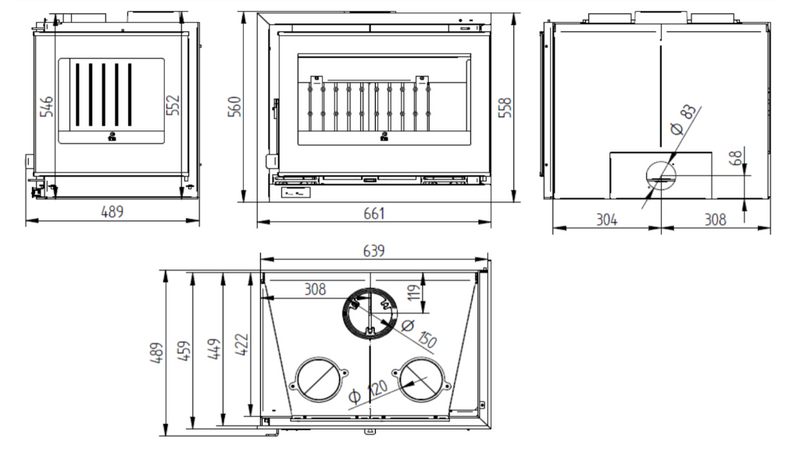 Equipo Elaborado en Acero hasta 4 mm. La estufa de leña IT-172 IFK está compuesta por: Puerta y parrilla de fundición, cajón cenicero extraíble, doble cámara, sistema de doble combustión, cristal serigrafiado 750ºC . Salida de humos macho Ø 150 mm en fundición. Doble cámara. Opción 2 canalizaciones. Incluye boquillas de canalización de 120 mm. Interior hecho de fundición y cristal serigrafiado. Dos ventiladores axiales de 20W de potencia capaces de mover 160 m3 de aire. Interruptor 2 posiciones, modo seguridad en posición 0.