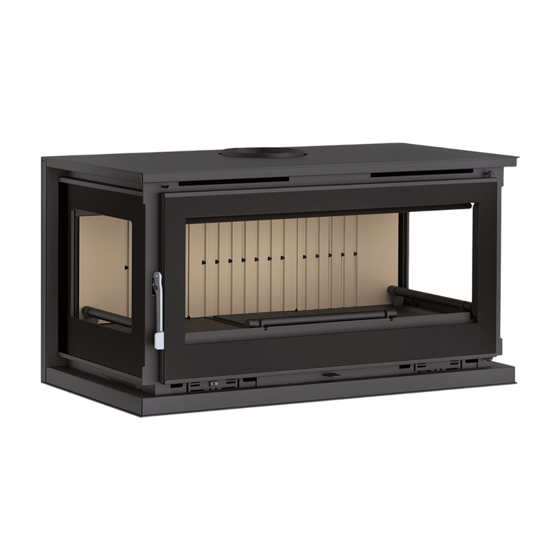 Calienta tu casa con una chimenea de leña. La leña es un combustible ecológico, con emisiones de carbono neutras. Esta estufa tiene una eficiencia del 81%. Gracias a su potencia nominal de 13,3 kW, podrás calentar un volumen de 360 metros cúbicos. Cristal en frontal y laterales, podrás ver la llama desde cualquier ángulo. El cristal frontal es serigrafiado, es decir, no tiene marcos metálicos.