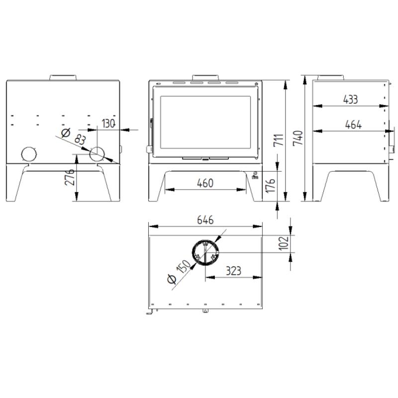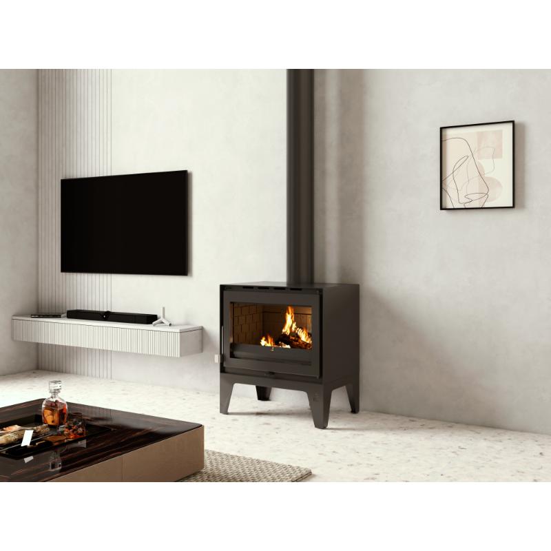 Esta chimenea está fabricada en placas de acero de hasta 4mm de grosor. Está pintada con esmalte anti calórico en color negro satinado, que resiste temperaturas de hasta 800ºC. Interior de la cámara de combustión de hierro fundido, un material que almacena el calor y lo libera lentamente, incluso tras apagarse el fuego. Cuenta con doble cámara y sistema de doble y triple combustión para conseguir la máxima eficiencia, quemando la leña y sus gases. Además, cuenta con sistema de cristal limpio, genera una corriente de aire delante del cristal que ayuda a mantenerlo libre de hollín durante más tiempo. Puerta y rejilla de cenizas fabricadas en fundición. Puerta con cristal vitrocerámico, resistente hasta los 750ºC. Salida de humos superior de 150mm fabricada en fundición.