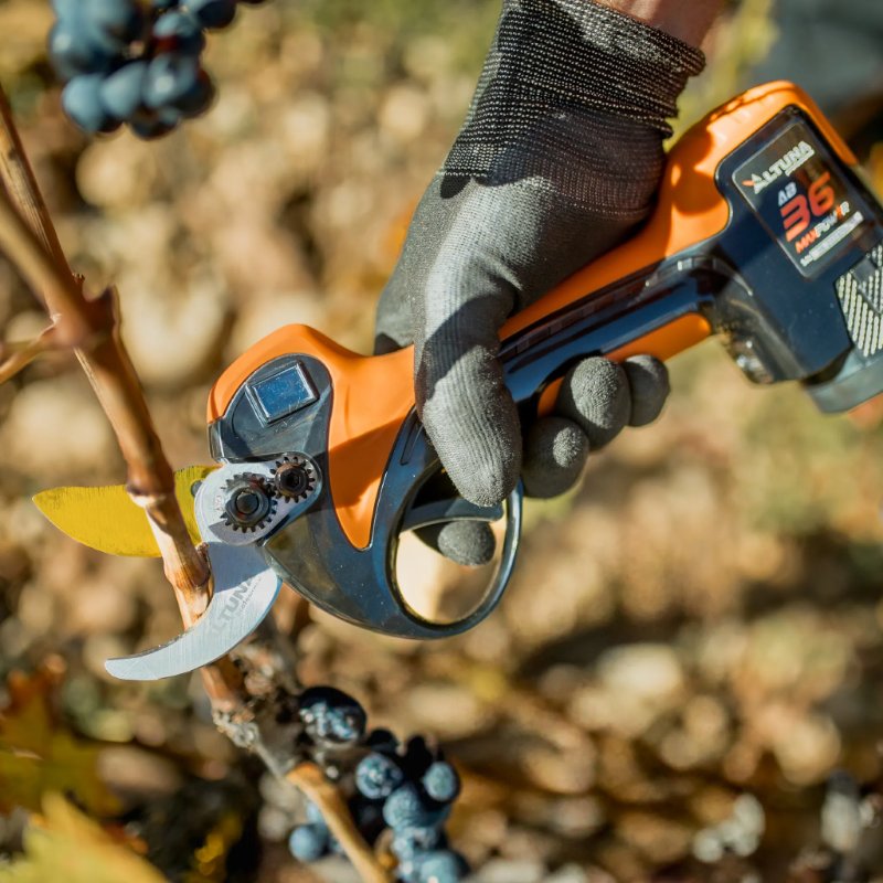Compacta y ligera, muy fácil de manejar. Cuenta con un agarre de goma antideslizante y su peso está balanceado. Su cuchilla es altamente resistente al desgaste, está fabricada para durar. Es perfecta para usar en viñedos y plantaciones de frutales. Tiene una capacidad de corte de 25 a 36 mm con corte progresivo, podrás controlar la hoja de forma precisa con el gatillo. Incluye dos baterías de 16.8V y 4,5 Ah que le dan una autonomía de casi 10 horas en conjunto. Incorporan un sistema de seguridad anti cortes, al detectar que la hoja está en contacto con la piel, la cuchilla se bloquea para evitar accidentes.